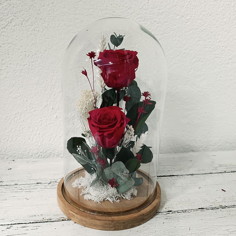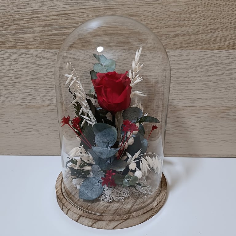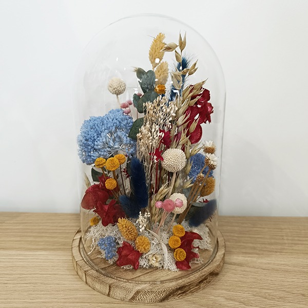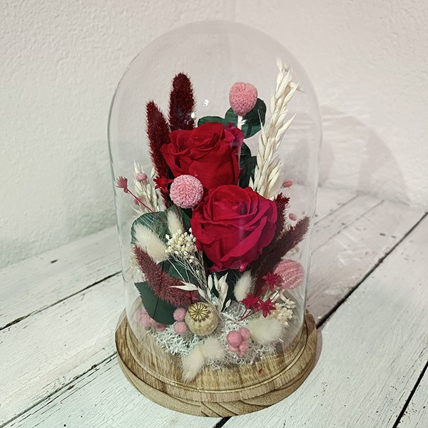 Para elegir vuestra cúpula lo único que tenéis que hacer es pasaros por nuestra tienda o escribirnos por whatsapp, os enseñaremos las flores y formatos de cúpulas que tenemos disponibles y elaboraremos una composición única para vosotros.